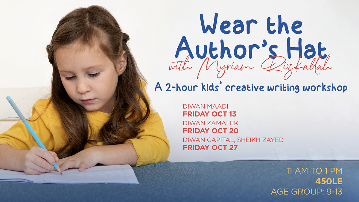 Participate in a two-hour writing session with author Myriam Rizkallah geared for children ages 9 to 13. Beginning at 11 a.m. and ending at 1 p.m., this class will provide young writers the chance to experiment with their imaginations. For more info, click here.