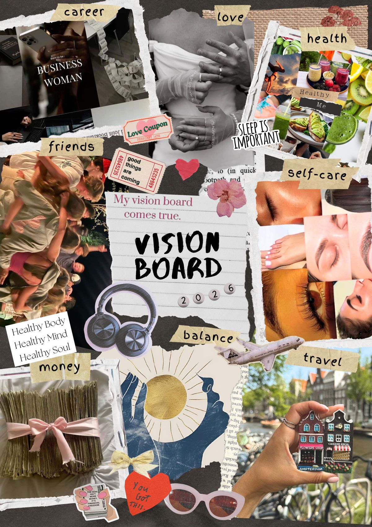 There’s no right or wrong layout, but be intentional. Some people like to group images by life category, while others prefer a more intuitive, free-flowing collage. Place the most important intention at the centre, or wherever your eye naturally goes first. Add affirmations, dates, or keywords to reinforce your vision.
